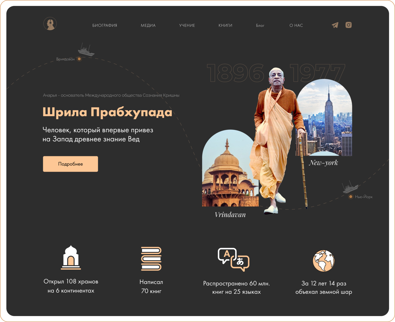 We were faced with the task of creating a website about Srila Prabhupada, where his life would be told in a simple and understandable language. All media materials about the teachings and life of Srila Prabhupada will also be collected. A person who has never heard of him can get comprehensive information